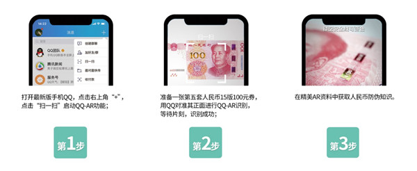 用户只要打开手机QQ,扫描第五套人民币100元纸币,就可以通过一段AR视频了解到人民币的防伪特征和文化内涵。